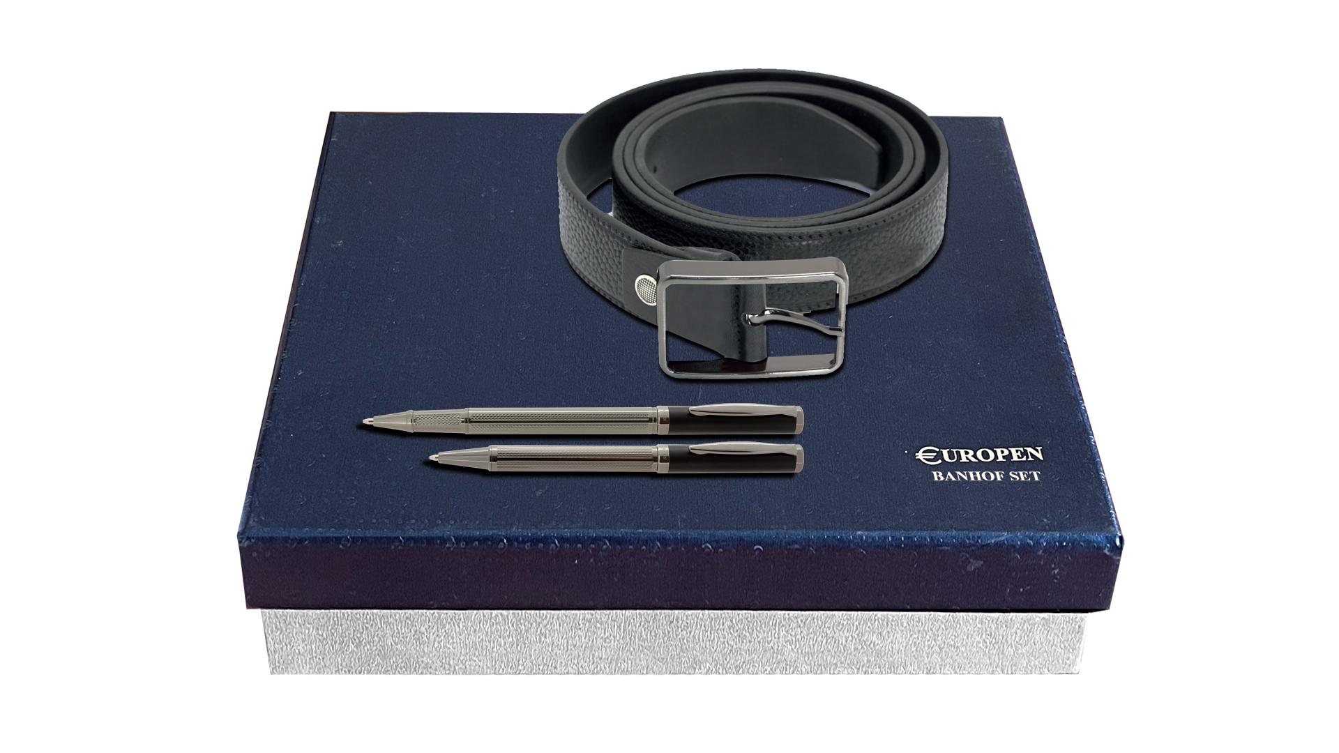 رنگ بدنه: ست خودکار و روان نویس نیمه مشکی دودی و کمربند با چرم طبیعی مشکی