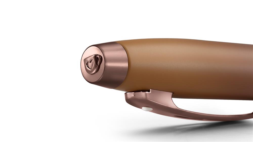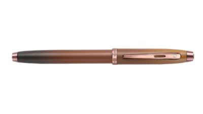 - قلم مزین به طیف رنگ ترکیبی قهوه ای مات پودری روی بدنه و نشان قهوه و قلب در مقطع بالای قلم