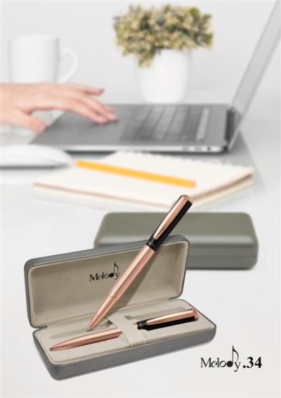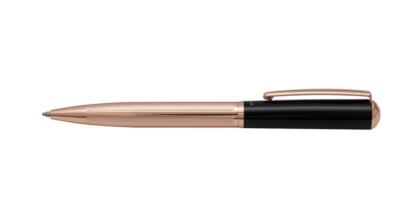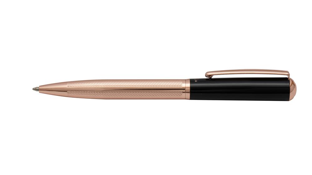 - فرم خاص گیره، مقطع گنبدی شکل بالای قلم و ترکیب طلایی رز گلد با مشکی وجه تمایز این قلم می باشد.