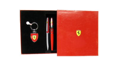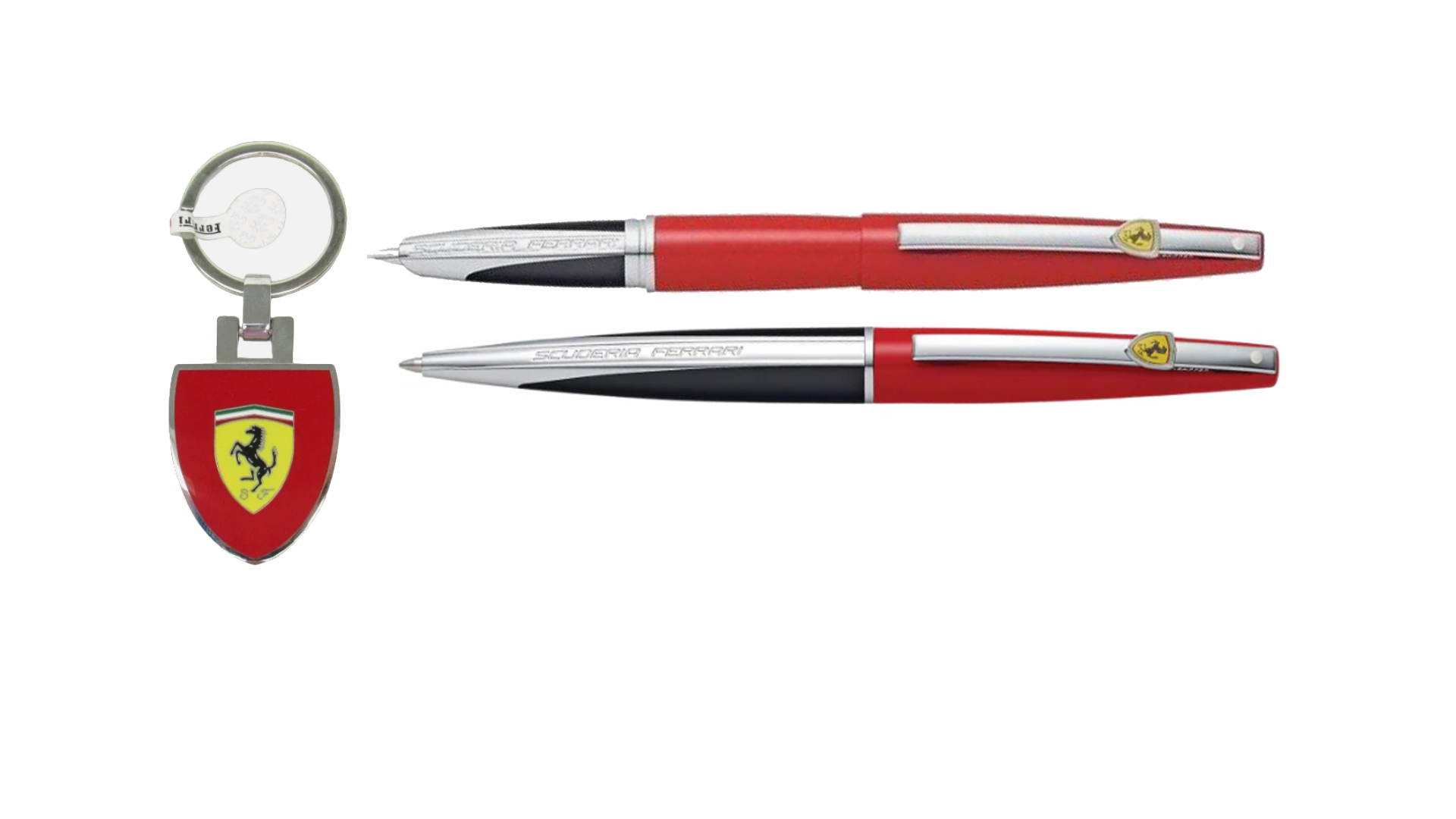 - گیره قلم ها و جاکلیدی مزین به نشان فراری ( اسب رقصان ) و نقطه سفید شیفر می باشد .